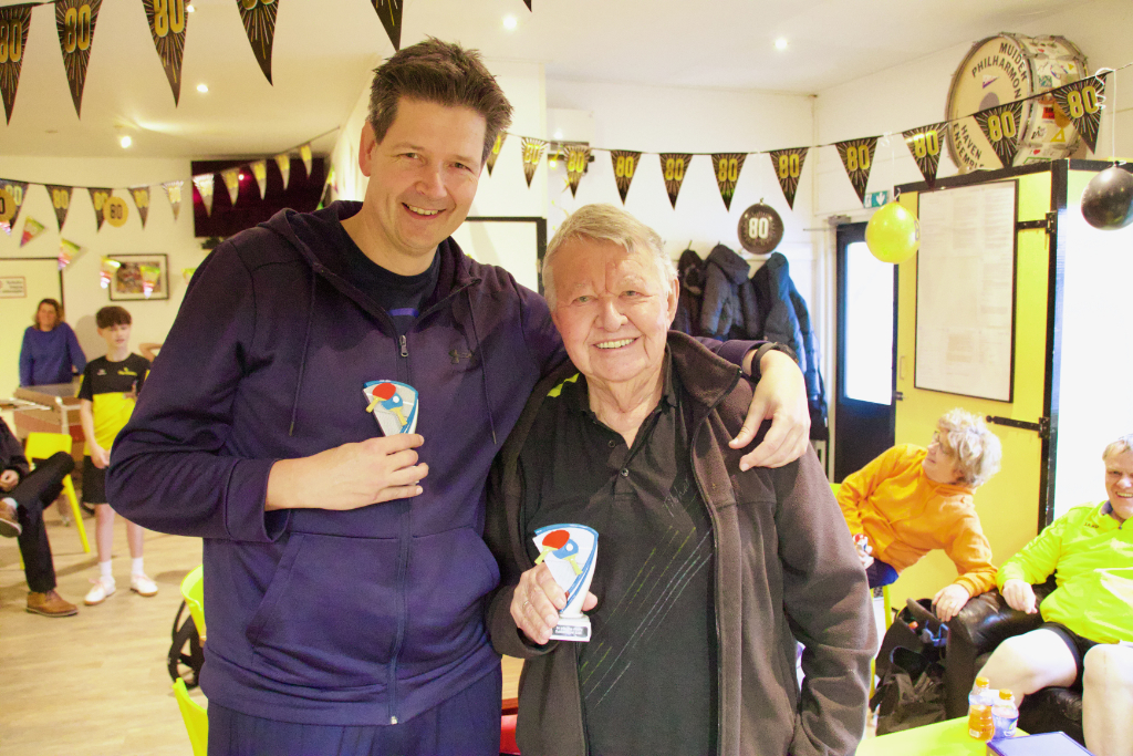 Er werd gespeeld in 2 poules (poule van 7 en poule van 6). Het ging er fanatiek aan toe. Niet iedereen kon zich beheersen en wilde meer voor de winst gaan, dan voor een prachtige partij. Maar wellicht hoort dat wel een beetje bij tafeltennis. Na ongeveer een half uur spelen kwamen de eerste koppels hun uitslag invullen. Voor de een teleurgesteld in 3 verloren, waarbij de ander blij was om net in 5’en te winnen.