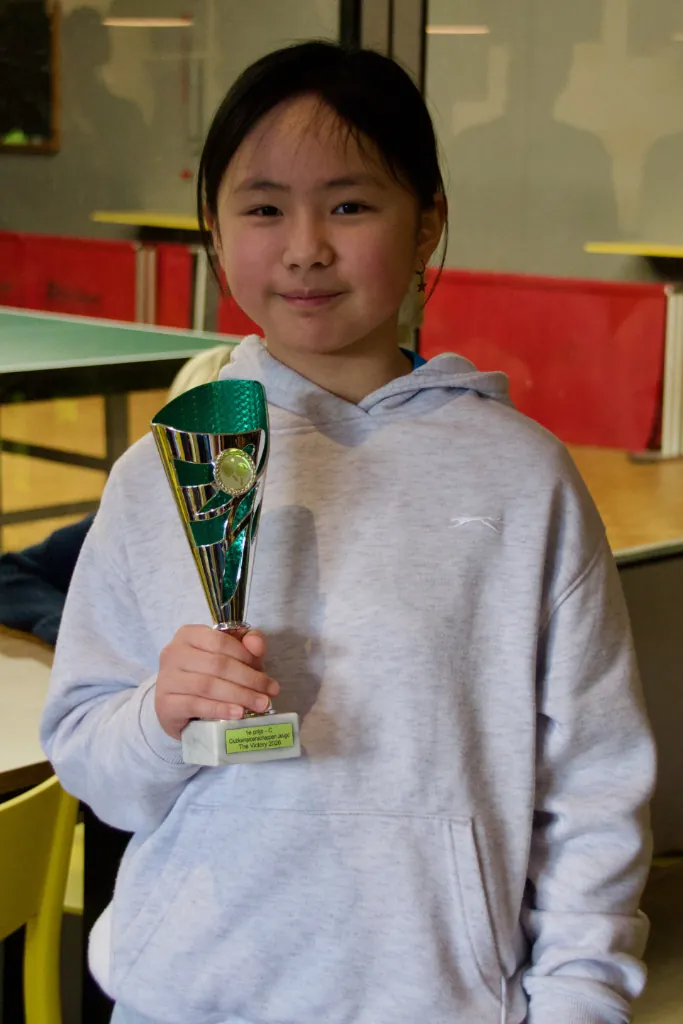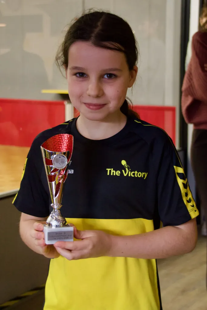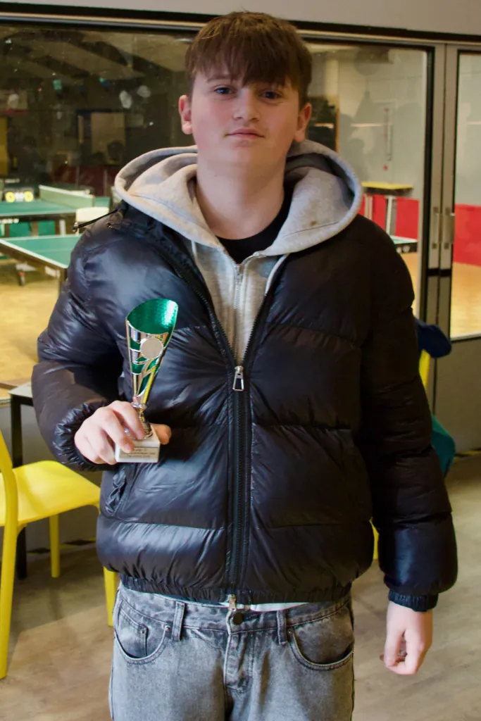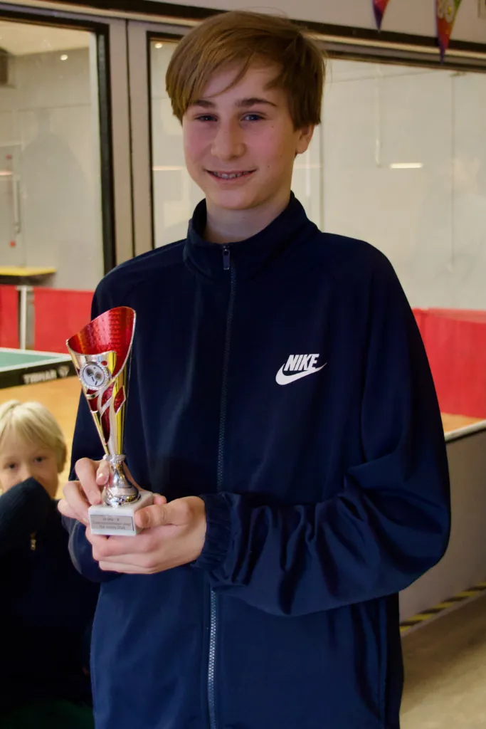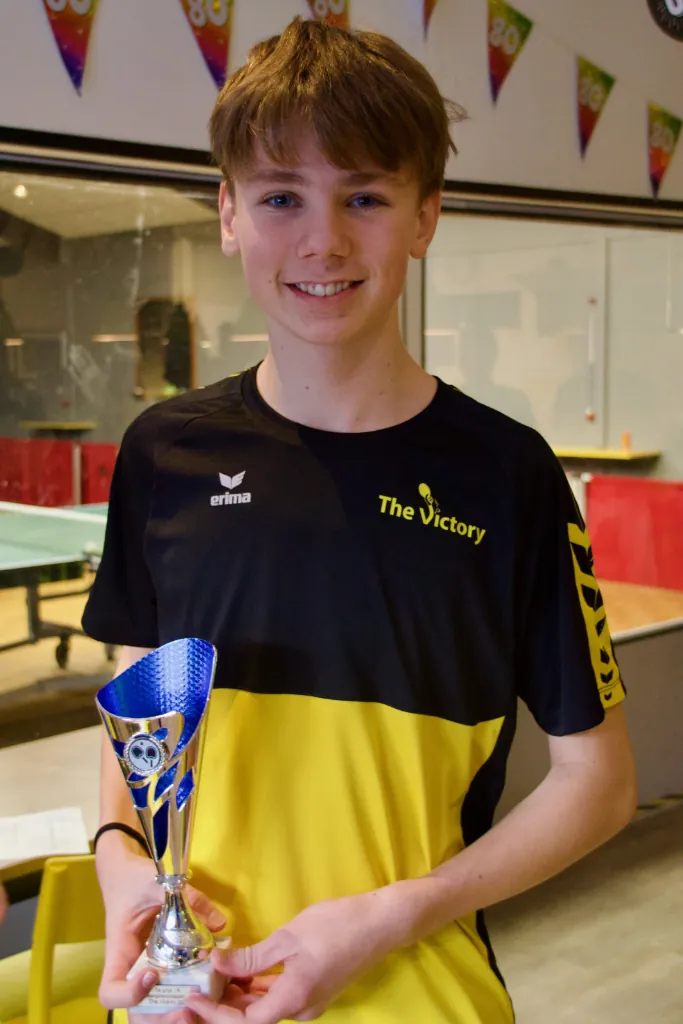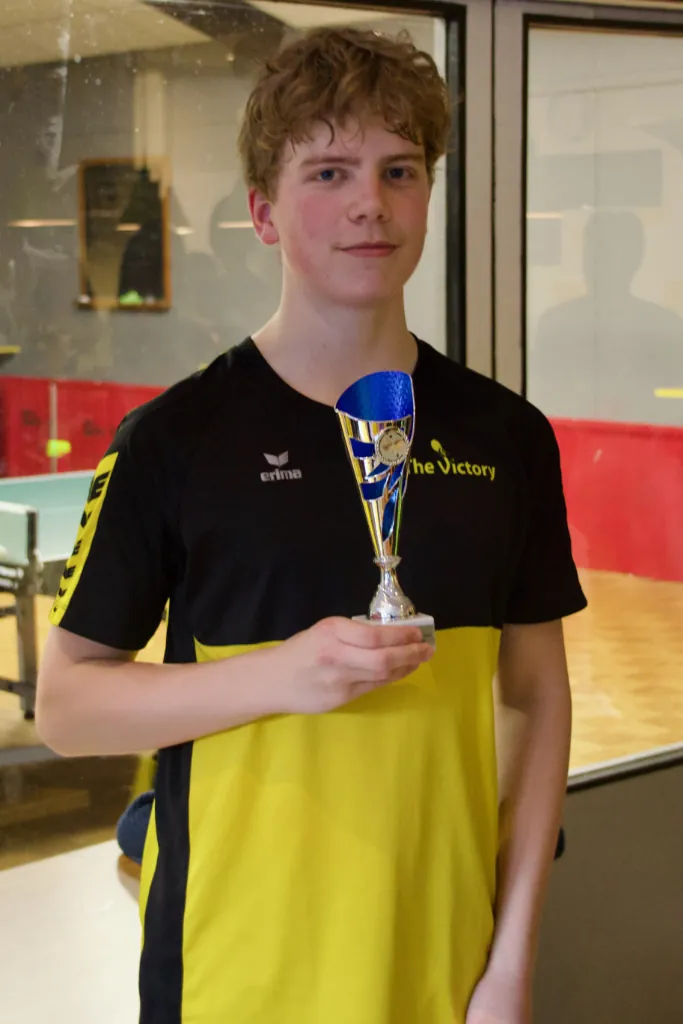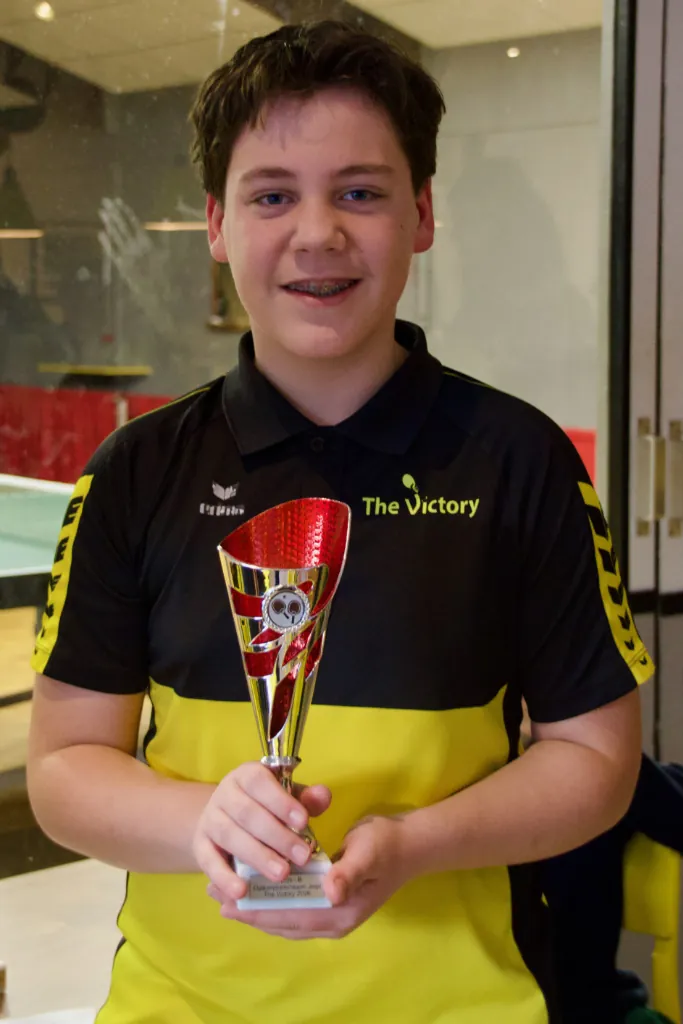 Bij de B-poule was het net zo spannend en daar ging de 3e plek naar Robin, die wist te winnen van Finn met 3-0. Het lijkt een eenvoudige overwinning, maar alle games gingen nipt naar Robin (11-8, 11-9, 14-12). De finalewedstrijd ging tussen Julius en Boas, twee teamgenoten. Ook hier een spannende 5-setter, waarbij Thijmen de laatste game pakte en dus kampioen van de B-poule werd.